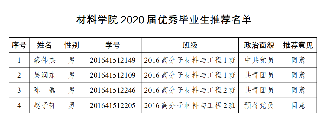 根据公司学工部、员工处通知要求,经个人申报、毕业班级充分讨论及班委会推荐,公司学工办审核并报公司党政联席会议研究,拟推荐2016级高分子材料与工程蔡伟杰等4名毕业生为英国正版365官方网站2020届优秀毕业生。现予以公示。