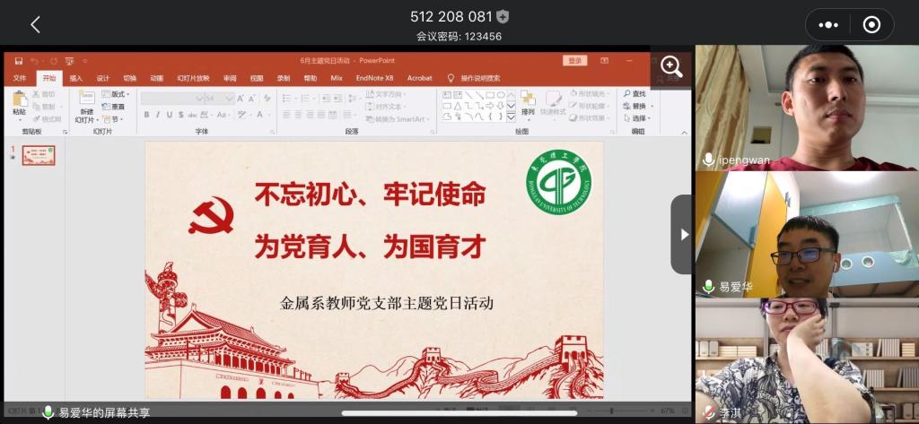 6月29日,金属材料系教师党支部开展在线“不忘初心、牢记使命,为党育人、为国育才”专题组织生活会,全体教师党员参会,会议由支部书记易爱华主持,英国上市公司365副经理李润霞教授出席了会议。