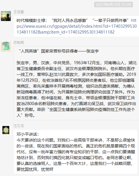 会议首先由郑轲带领与会党员集体学习贯彻习近平总书记《用好红色资源,传承好红色资源,把红色江山世世代代传下去》重要文章的通知(简称《通知》)。根据文件要求,我们要充分挖掘红色基因,红色精神等红色资源,用创新的方式讲好革命先烈、当代英雄的故事。特别是卢永根、终南山等身边榜样的先进事迹,形成具有特色的“红色故事汇”。最终引导党员干部在学思践悟中传承红色基因,锤炼党性修养。随后,各与会党员从身边的榜样、学习强国学习感受等方面分享了优秀党员的先进事迹,如邓小平、刘少奇、铁人王进喜、共和国勋章获得者申纪兰、张维为、彭士禄、张定宇等在共和国建立和建设过程中涌现出的优秀党员代表可歌可泣的感人故事以及全心全意为人民服务的精神。同时与会党员也将分享的党员故事推送到教师党支部工作微信群,供大家继续学习。