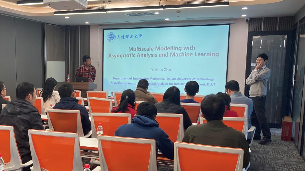 朱教授以《渐近分析与机器学习耦合之跨尺度建模方法研究》为题,深入介绍了传统渐近分析方法与新兴机器学习工具结合的新研究方法,并分享了在跨尺度系统开展建模与仿真领域取得的重要创新成果。报告以多尺度点阵渐变填充结构的优化设计为出发点,利用渐近均匀化分析显式推导描述点阵渐变构型局部等效刚度矩阵的系列单胞偏微分方程,利用神经网络避免反复求解单胞问题,同时考虑该方法与计算机辅助几何平台(CAD)的对接,以推动“结构分析-优化一体化功能”的实现。最后,报告讨论了渐近分析-机器学习耦合方法在其它跨尺度物理系统场景的应用,包括发展材料辐照损伤长时模拟、位错连续动力学模型的推导,并从量子力学视角刻画材料表界面效应等。