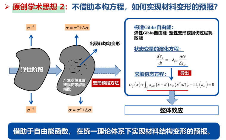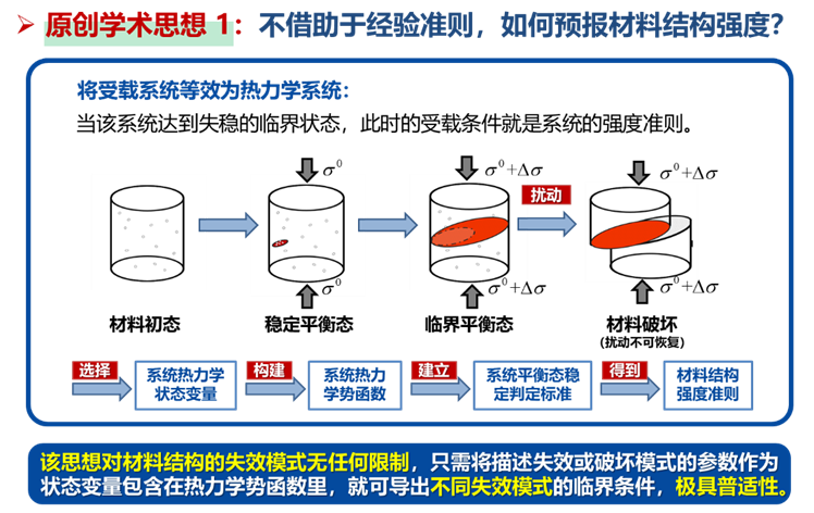 长期以来,作为固体力学的核心问题之一,如何准确地预报材料结构强度和变形的问题一直未能得到圆满的解决,导致工程结构安全可靠性一直面临重大的挑战。中心拟将外载作用下的材料结构等效为非平衡态演化系统,结合材料结构的失效机理,建立其热力学演化方程,从而得到稳态方程和临界平衡条件,最终实现变形预报以及导出材料结构不同失效模式的破坏准则。该理论体系摒弃基于经验的强度准则以及材料的局域本构方程,可实现对材料结构强度和变形局域化的准确预报,极具原创性。该项目有望为工程材料结构精细化设计提供可靠的理论依据和设计基础,最大限度发挥材料的潜能,将给社会带来不可估量的社会和经济效益。