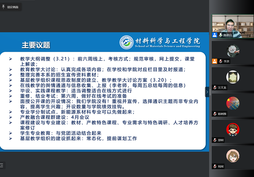 为保障疫情防控期间在线教学工作的正常开展,落实公司“停课不停教,停课不停学”的要求,确保线上教学工作运行稳中有序,公司于3月16日19:00线上召开了公司本学期第二次线上教学管理会议。会议由公司教学副经理陈德良主持,经理助理杨树颜副研究员、各系正副系主任、实验室主任和教学工作人员出席了本次会议。