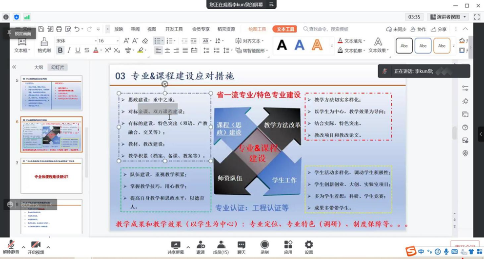 首先,李坤泉老师对高分子系上学期的教学工作进行了汇报和总结,并针对线上教学工作以及毕业设计开展存在的问题进行了反思。随后,对本学期教学工作及思政建设任务进行了统筹安排。同时,李坤泉老师结合省一流专业建设、专业评估以及人才培养方案的要求,提出了高分子系在“专业与课程建设中面临的瓶颈短板及其对应破解举措”,并动员全系教师积极参与专业和课程建设,挖掘专业建设的亮点与不足,有的放矢,重视教学效果和教学积累,突显特色,有规划的进行一流专业和课程建设工作。会议期间,高分子系教师刘啸天、钟赤峰、吴文剑、梁俊飞、赵雁飞、张东东等人进行了专题发言,对课程安排、思政建设、员工培养、实习实践、教学评价、课程建设和认定等专题进行了深入讨论。最后,明确了各位老师在本学期专业建设和教学工作中的任务,在专业和课程建设内容和应对措施方面达成了普遍共识。
