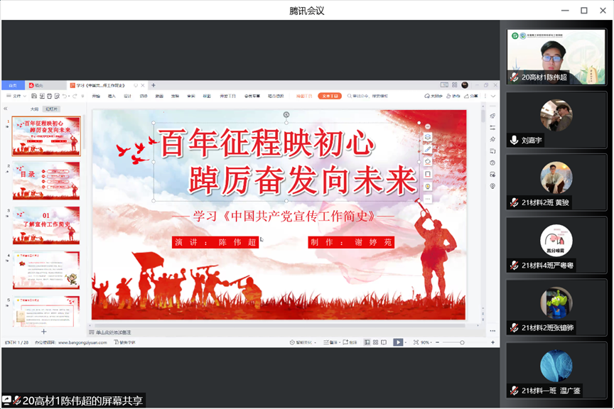为贯彻落实公司党委有关深入开展党史学习教育的部署,加强对员工支部、团学组织的培养教育,5月1日晚,英国上市公司365召开了线上微党课,重点《中国共产党宣传工作简史》。此次微党课指导老师为员工第一支部书记杨壮鹏老师,宣传部主要负责人陈奕琳同志组织,陈伟超同志做《百年征程映初心、踔厉奋发向未来》的主题演讲,公司第七期入党积极分子和团学组织员工参加。