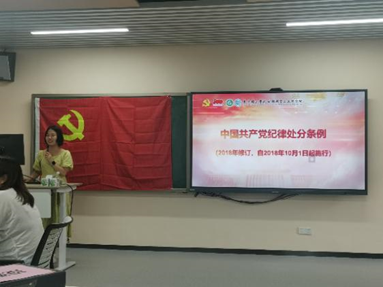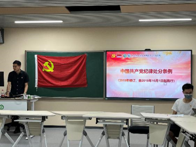 各支部重点围绕《中国共产党纪律处分条例》进行了学习。各支部书记就党的纪律处分工作原则以及对党员的纪律处分种类进行了介绍。此次活动结合了近期中央纪委国家监委对多起违反中央八项规定的精神典型问题进行了警示性学习,并要求同学们要不断加强党的政治纪律教育,不断为精神和思想补钙,做到不睬红线、不越底线、不闯雷区。与会师生党员随后进行了学习心得交流。