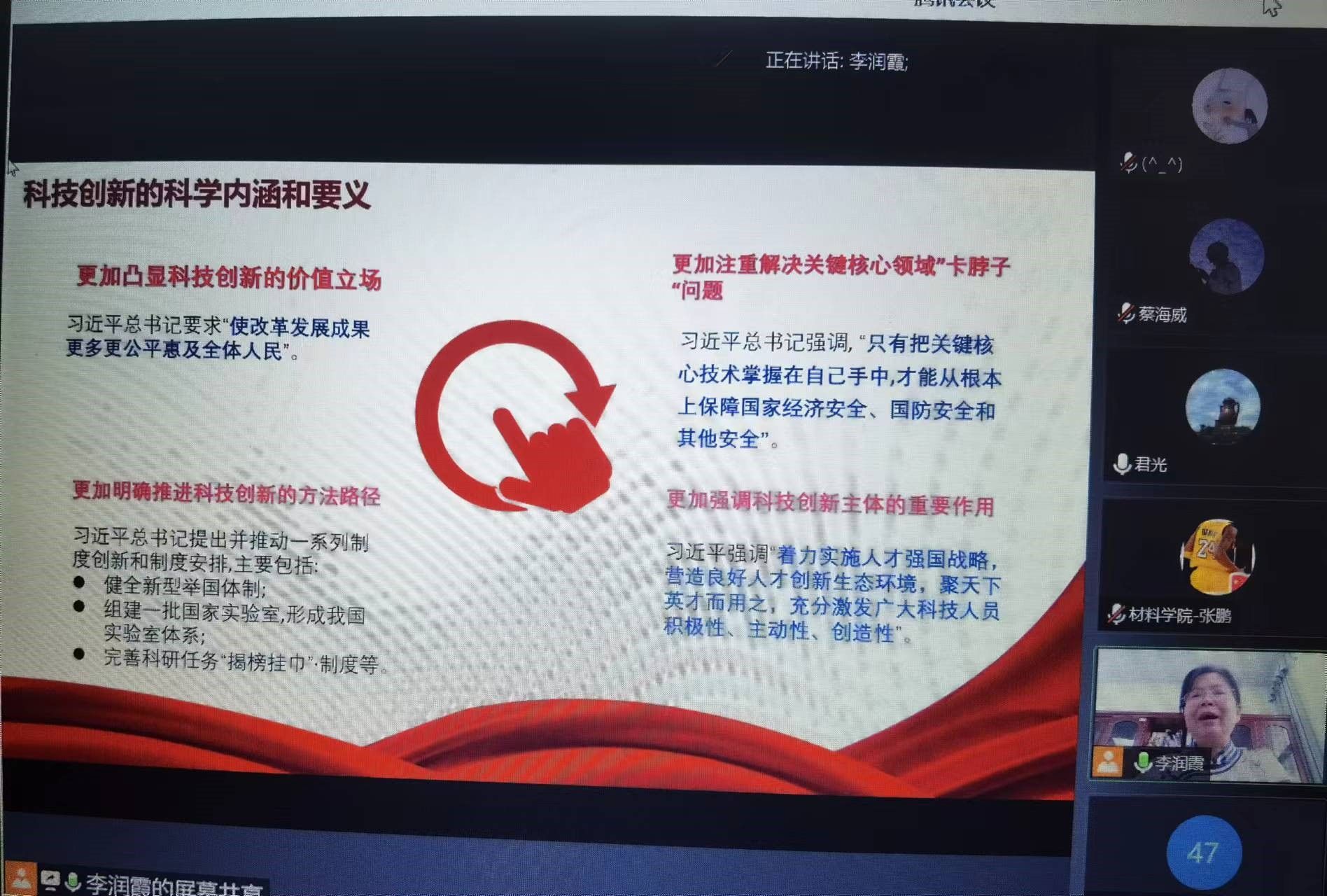 李润霞副经理以《以科技创新支撑高质量发展》为主题,带领全体教职工重点学习了习近平总书记关于科技创新的重要论述,以科技创新的科学内涵和要义,提出科技创新是破解增长瓶颈的关键,科技创新是贯彻新发展理念的支点,作为高校科研人员,我们要进一步发动科技创新的新引擎,以高度的政治责任感和历史使命感,为实现中华民族伟大复兴的中国梦、推动构建人类命运共同体作出新的更大贡献。