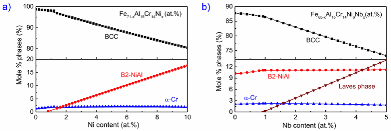 团队基于前期在包壳材料开发方面的经验,采用热力学计算和实验相结合的方法,设计了Laves 相和B2 相与BCC 基体复合的新结构,开发了双相强化新合金,以充分结合Laves相在1000-1200°C下提高合金组织稳定性、B2在600°C以上提高合金高温力学性能的优势,从而开发有望满足ATF 包壳材料综合性能需求的新合金。
