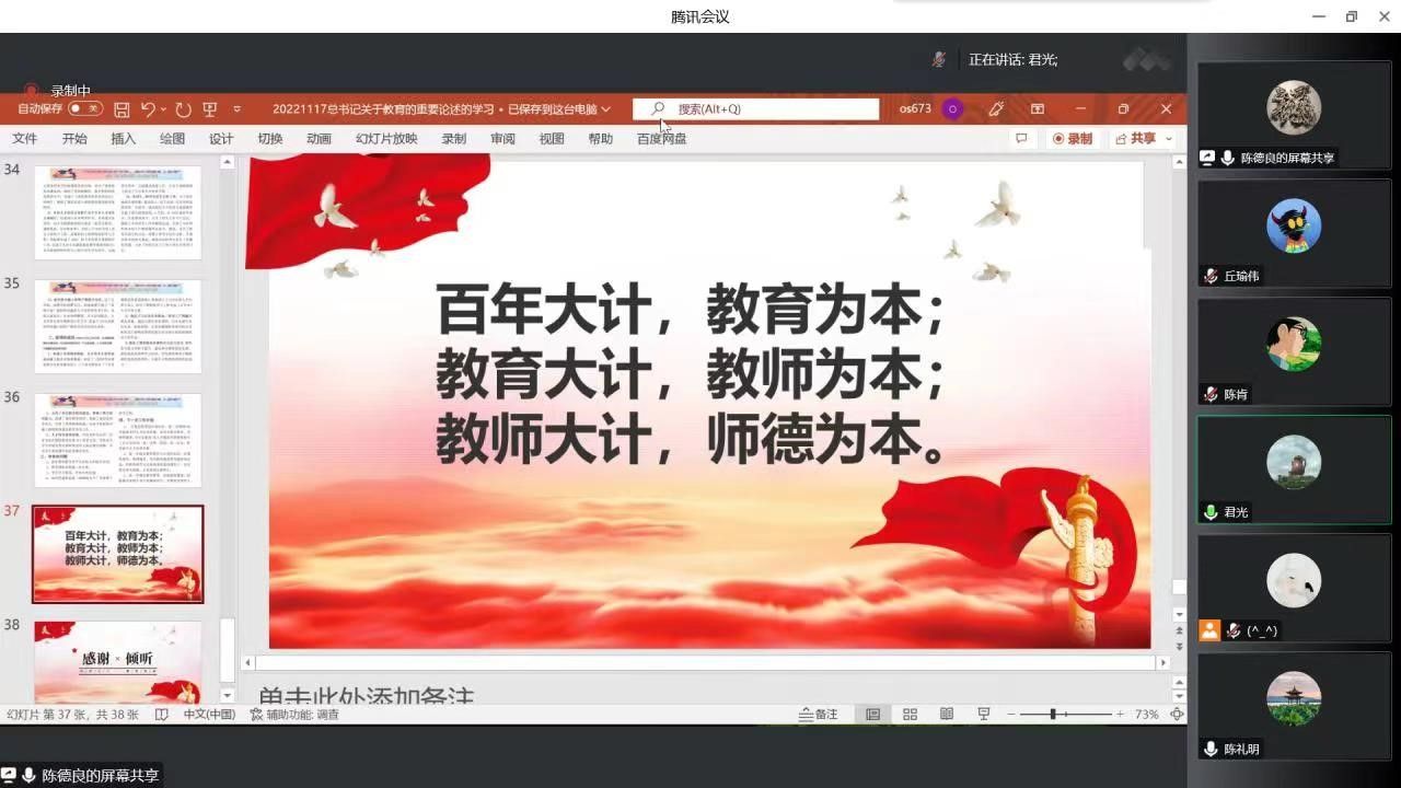 陈德良副经理摘选了习近平总书记在党的二十大报告中和其他会议上关于教育的重要论述展开了学习,组织学习了《高等公司课程思政建设指导纲要》。最后,他结合今年的公司产品大讨论情况,对公司下一步如何贯彻落实做了工作设想。
