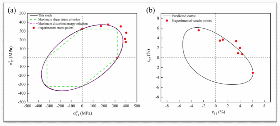本工作研究人员以6061铝合金为对象,设计了单轴和双轴拉伸实验方案,准确地得到在不同加载条件下的破坏强度。理论建模的整体思路是将体系塑性变形与其整体平均失配作为本征应变,导出了在特定加载条件下引入塑性变形导致的Gibbs自由能的变化。再根据非平衡热力学,导出塑性变形扰动的演化方程,并得到塑性变形的稳态条件和破坏的临界条件,通过单轴和等双轴拉伸试验确定了塑性耗散能量密度函数的展开系数。最后,预报出6061铝合金在应力空间和应变空间的破坏强度,与实验结果非常吻合。此外,研究人员将本工作的理论预报结果与两种经典强度理论(最大剪应力理论和最大畸变能理论)结果进行对比。本研究验证了预报材料结构强度的统一热力学理论的准确性和可靠性,为其在工程领域的应用奠定了基础。