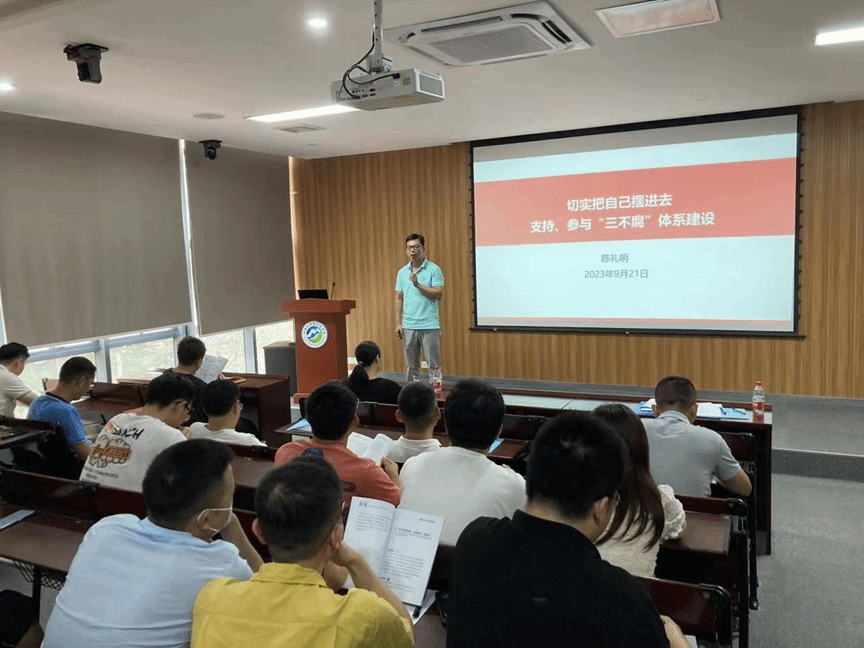 陈礼明副书记以《切实把自己摆进去,支持、参与“三不腐”体系建设》为题,传达了二十届中央纪委二次全会精神,分析了高校常见的七大腐败问题,以案说法,强调要一体推进不敢腐、不能腐、不想腐是反腐败斗争的基本方针,号召广大教职工要坚守行为底线,不断涵养高尚师德,落实立德树人根本任务。