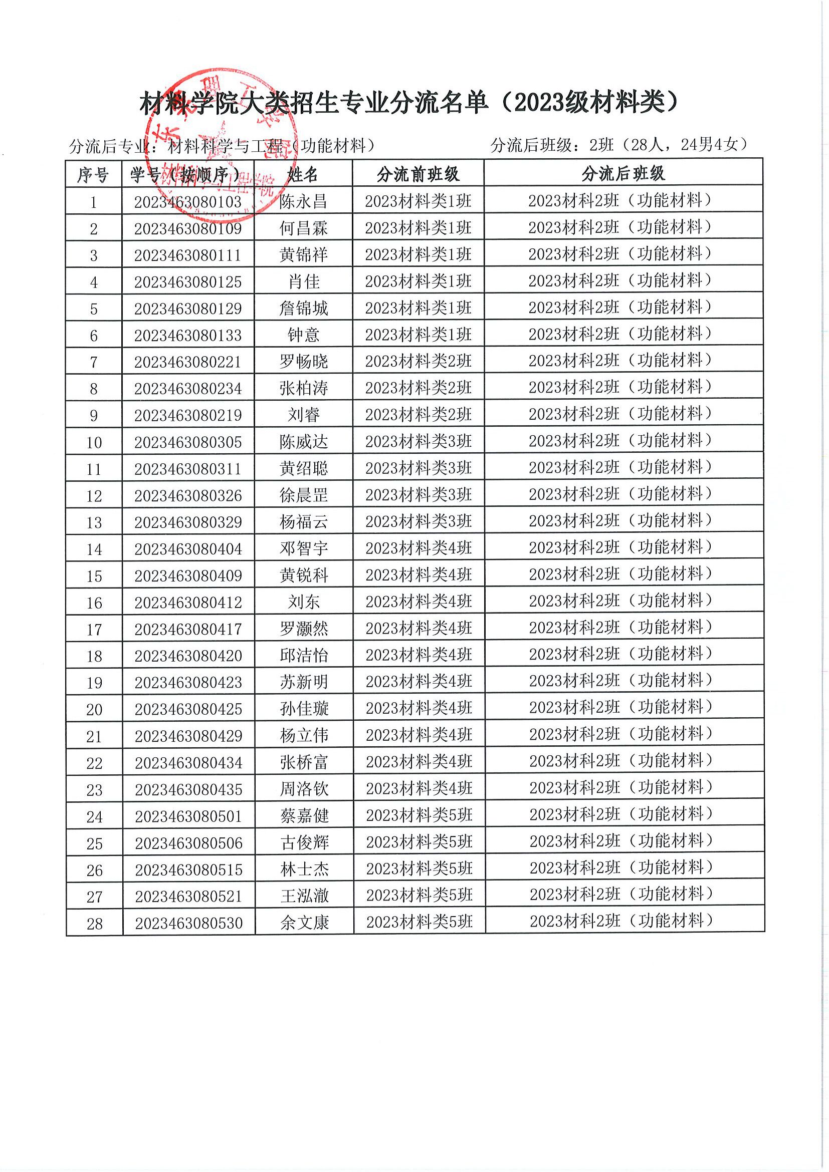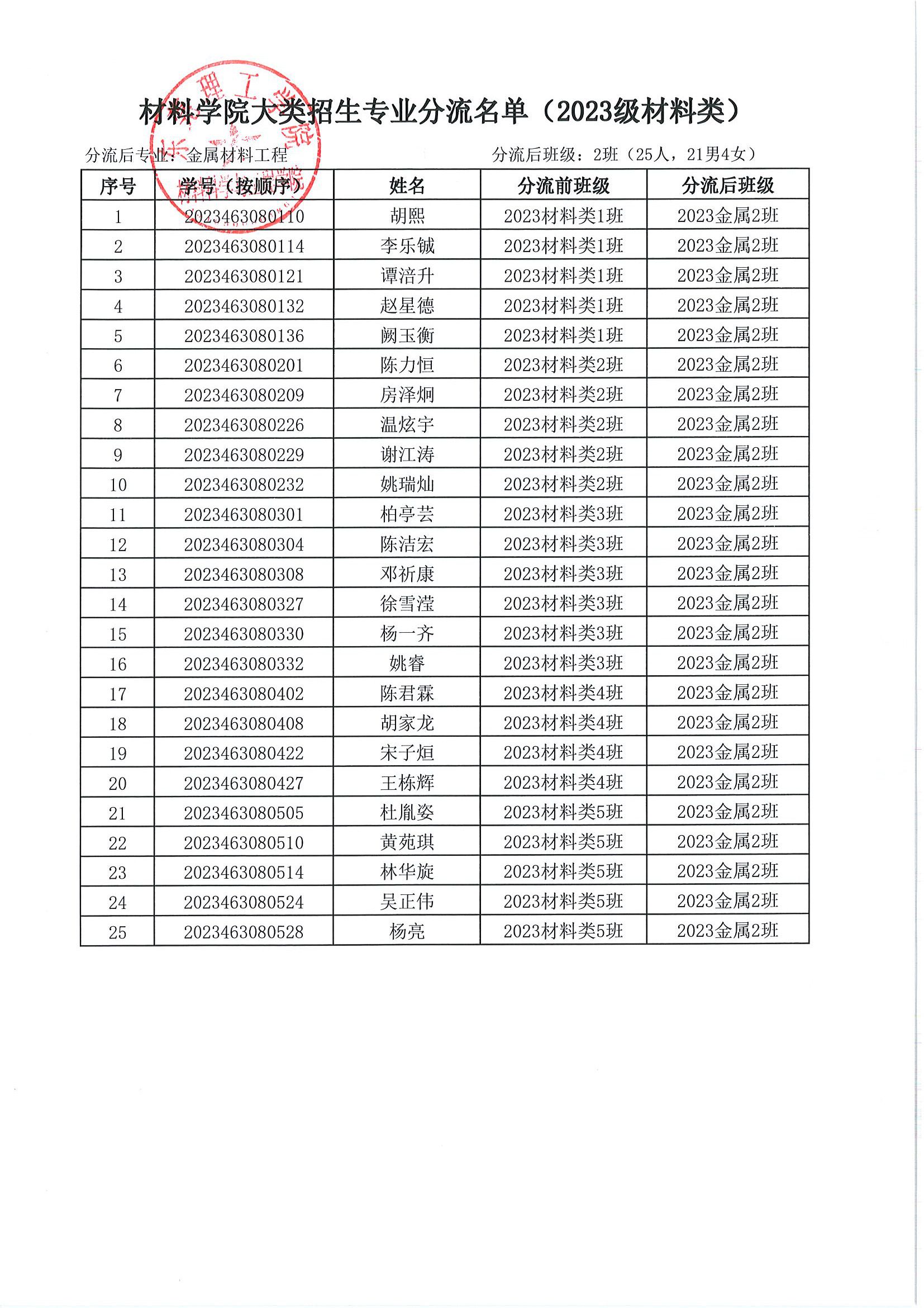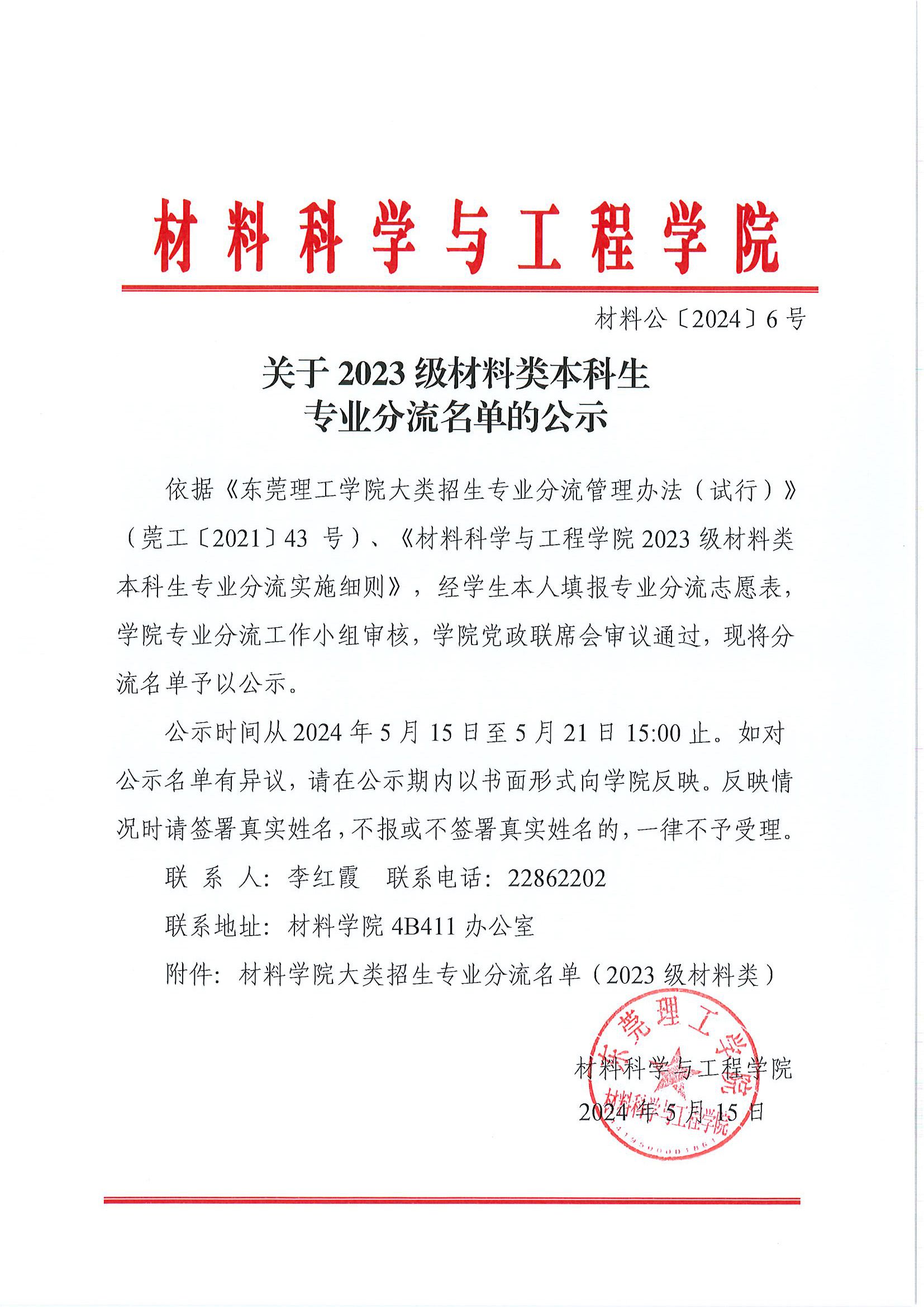 关于 2023 级材料类本科生专业分流名单的公示