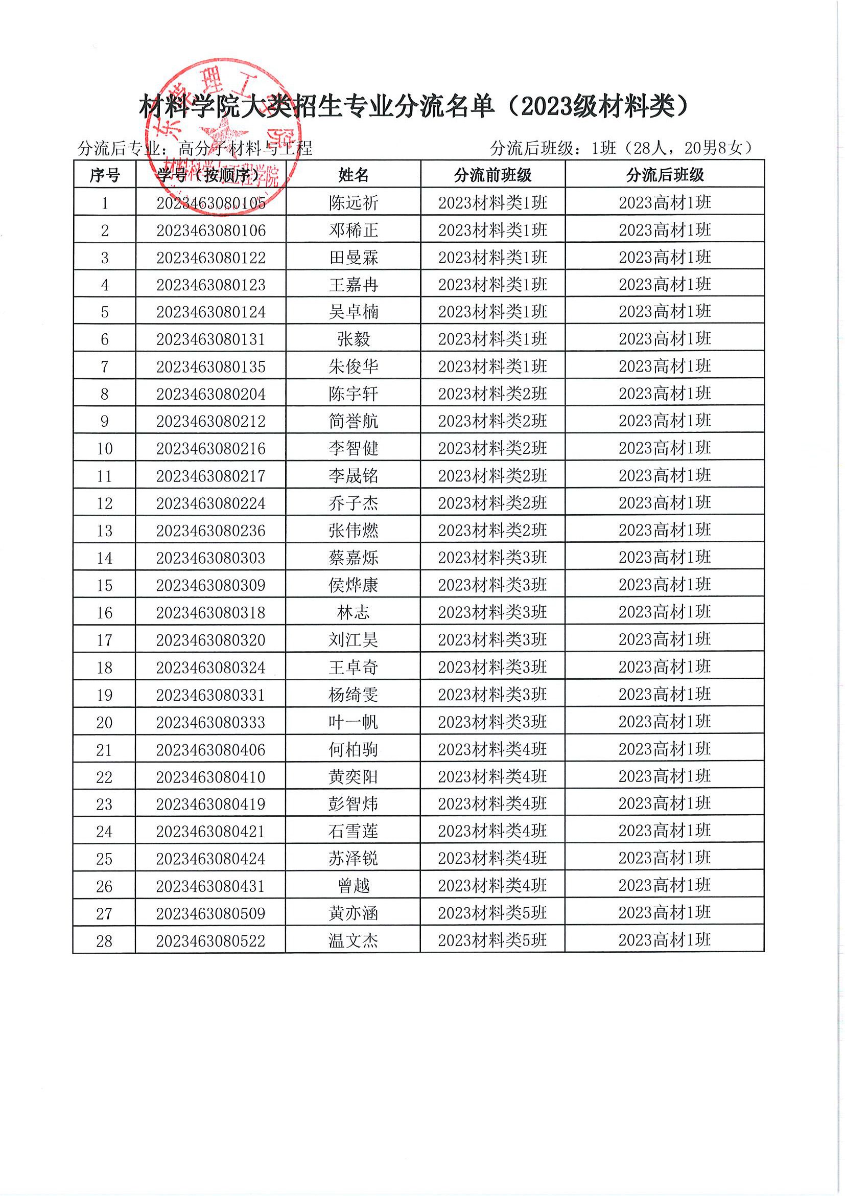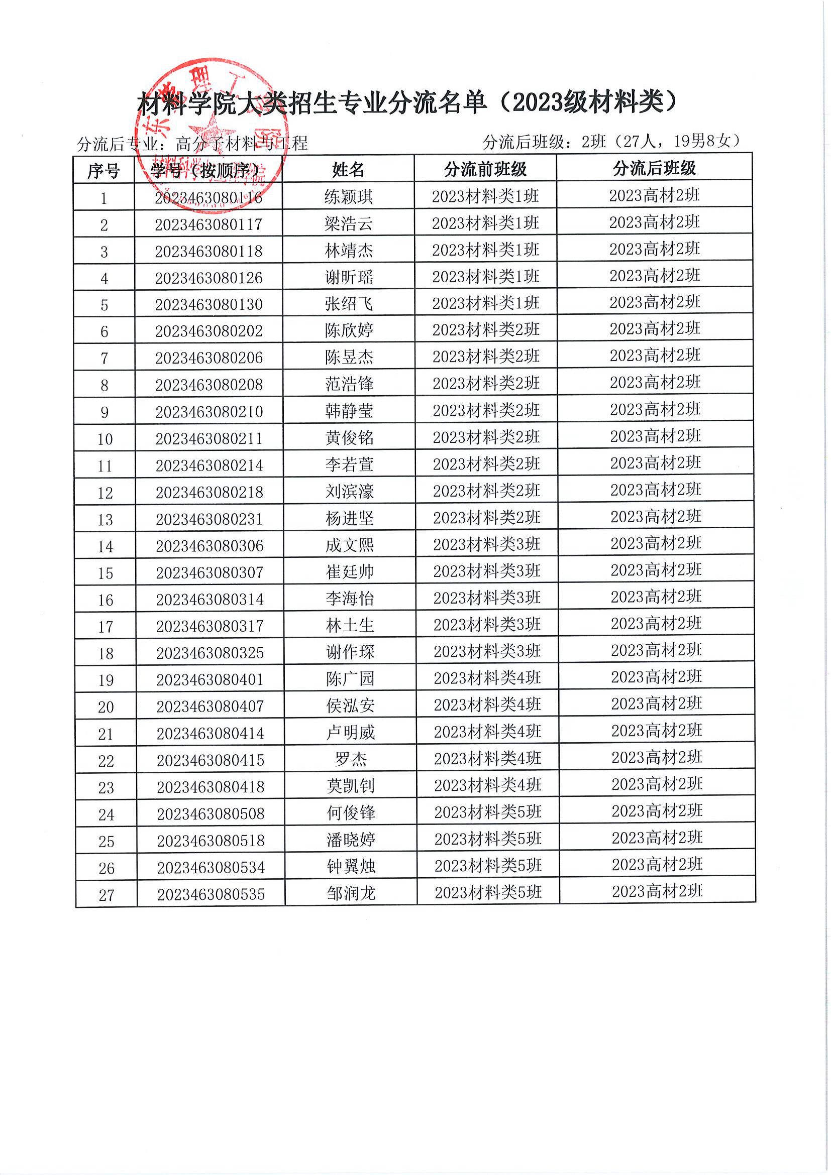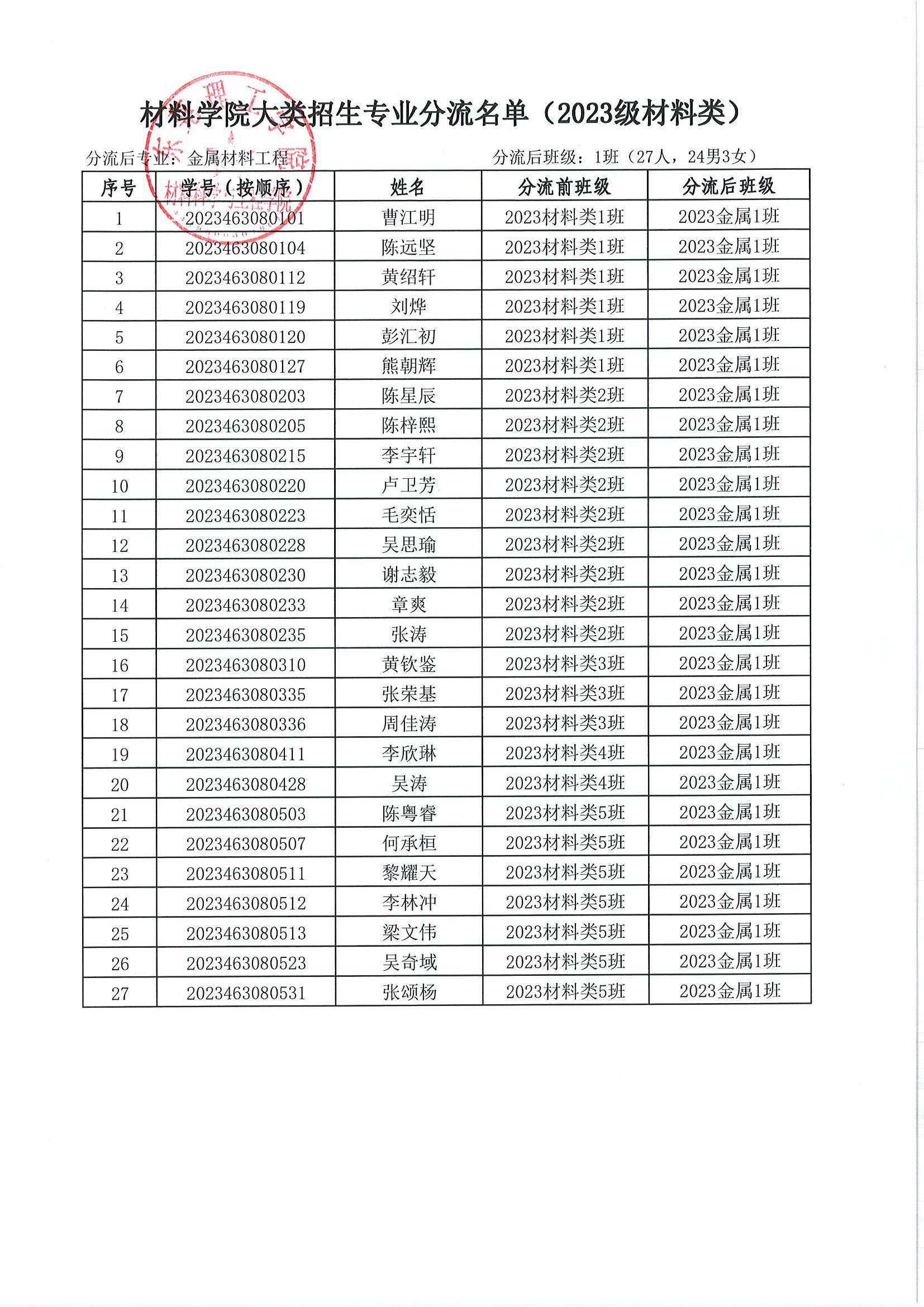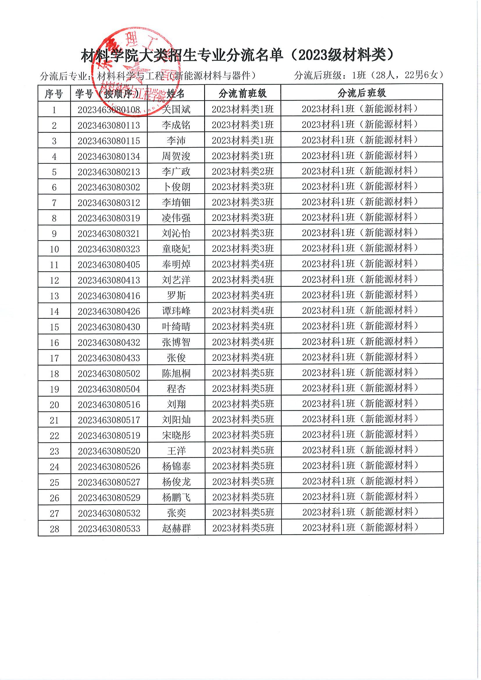 关于 2023 级材料类本科生专业分流名单的公示