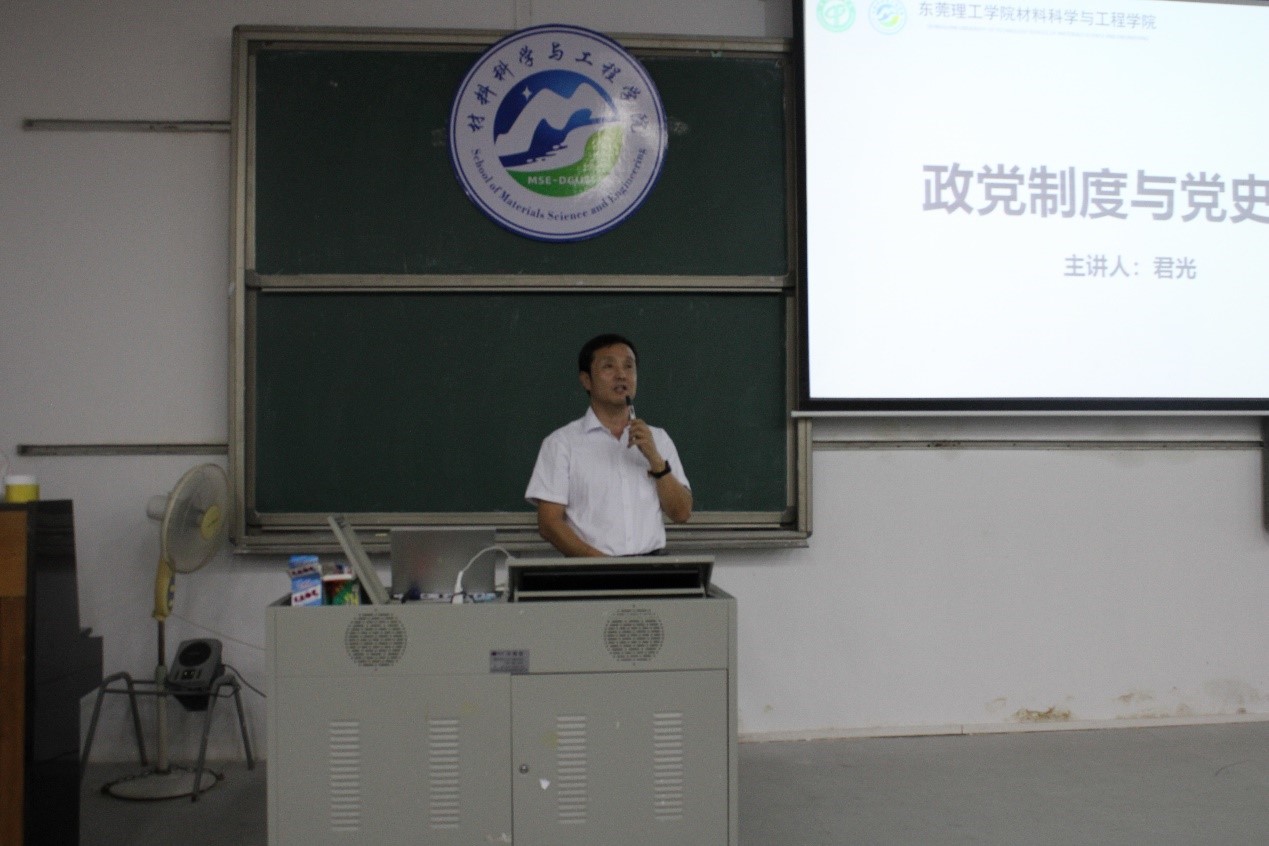 会议伊始,由君光书记为同学们讲述政党制度和党史。首先,君光书记号召了新生积极入党,强调了入党是一件光荣的事、是一件锻炼自身能力的事,入党可以明确自己前进的方向,约束自身的行为和谈吐。其次,君光书记从中国近代史开始为同学们讲述中国共产党的党史,与其他国家的政党进行了比较,突出了中国共产党社会主义制度的优点。