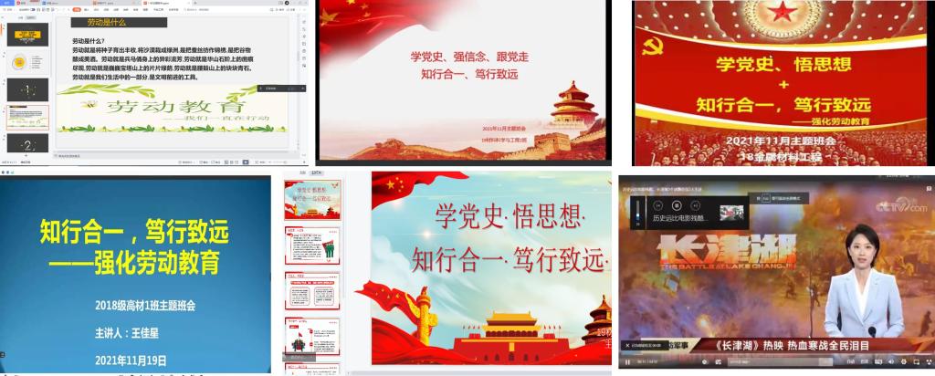 在党史学习方面,既有班级通过组织同学们观看党史相关电影,以更加生动形象具体的方式开展党史学习,引导广老员工增强信念、砥砺前行;也有员工党员通过“抗美援朝战争”“中国共产党成立100周年”“抗疫时代精神”等主题演讲,激励同学们的爱国热情;也有班主任带领员工高唱《共青团之歌》,振奋学习与科研斗志;更有班级开展党史知识竞赛活动,营造争先创优的学习氛围。