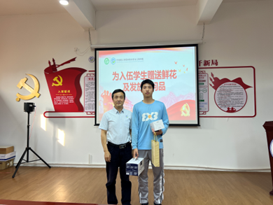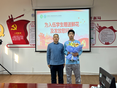 最后,会议为预定新兵和退伍老员工代表赠送鲜花及发放慰问品,勉励新一代青年担负起神圣使命,圆满完成任务,并要求在场的退伍复学同学,能够继续发挥军人的光辉,在校园学习生活中,能够找准定位和目标,再创佳绩。